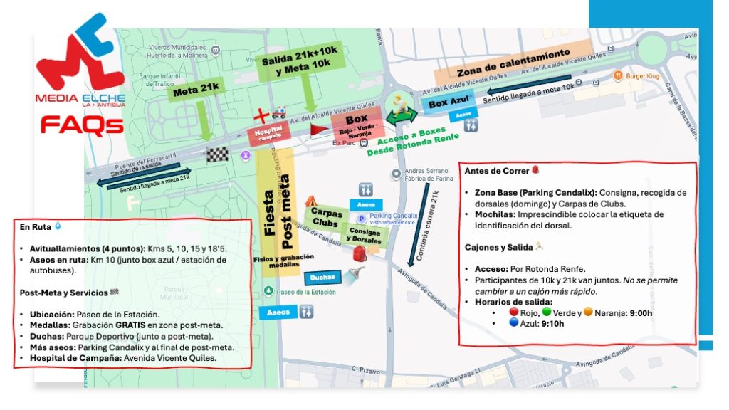 Salida a las 9 de la mañana junto a la estación de tren Elche Parque Ubicación de la salida y meta Recomendaciones Tráfico Policía Local de Elche PARKING Descarga el GPX del 21k Descarga el GPX del 10Kk En el siguiente mapa puedes ver la ubicación de los servicios en la zona de salida y meta